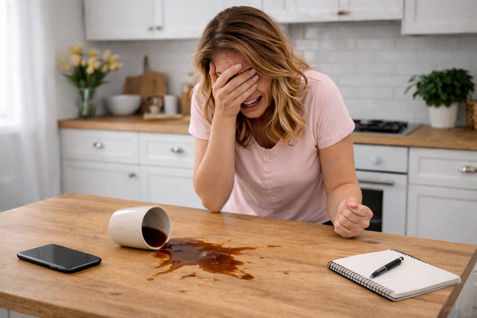 I snap over spilled coffee.
